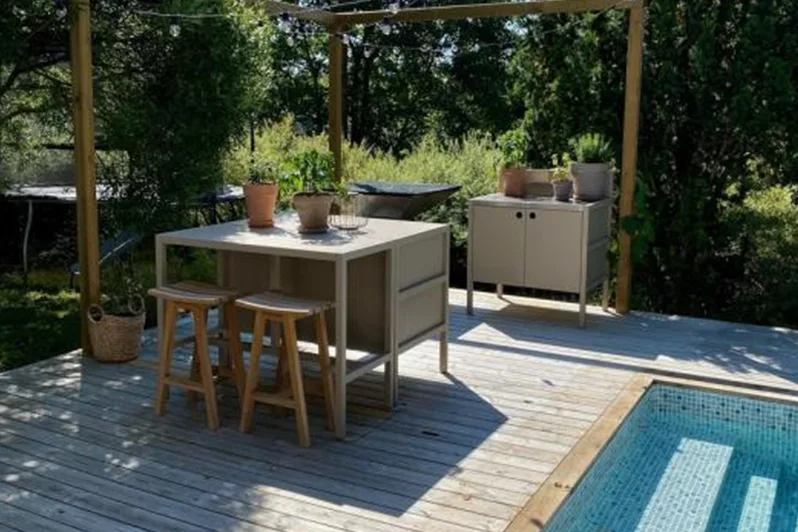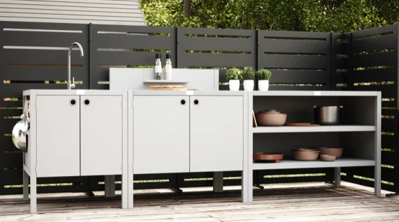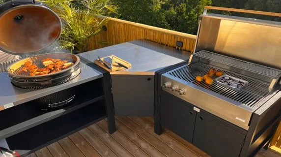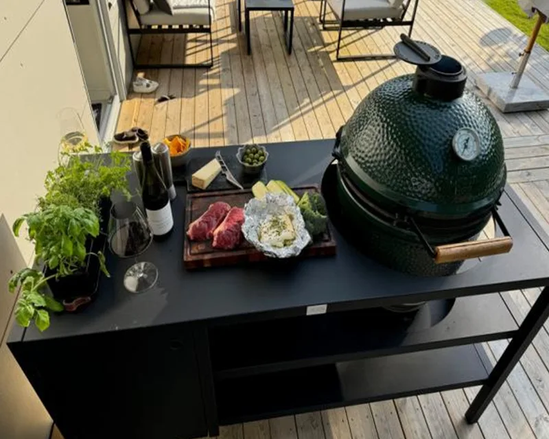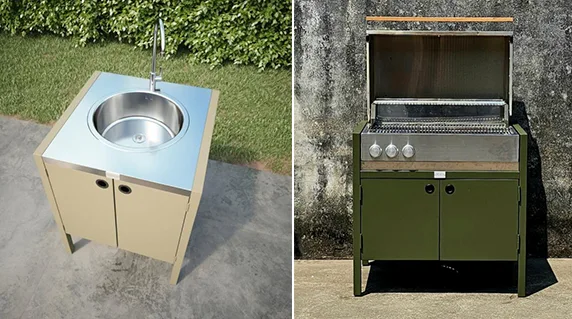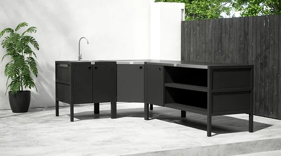 Модулната система от външни шкафове позволява гъвкави комбинации от мивки, печки, ъглови модули и модули за съхранение, което ви позволява да създадете вашата идеална външна кухня. Здравите плотове и добре организираното вътрешно съхранение правят готвенето на открито толкова лесно и ефективно, колкото и на закрито.
